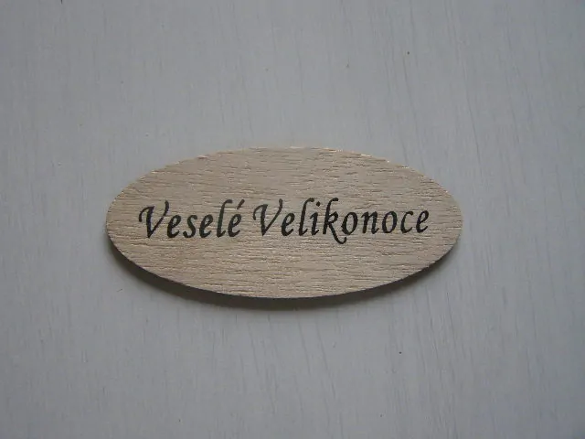 Oválná dřevěná cedulka s nápisem Veselé Velikonoce.