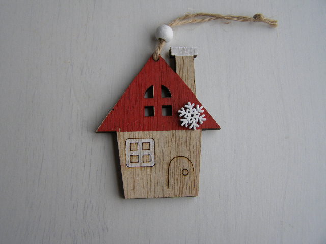 dřevo závěs - domek s červenou střechou a vločkouskladem 17 ks25 Kč/ ks