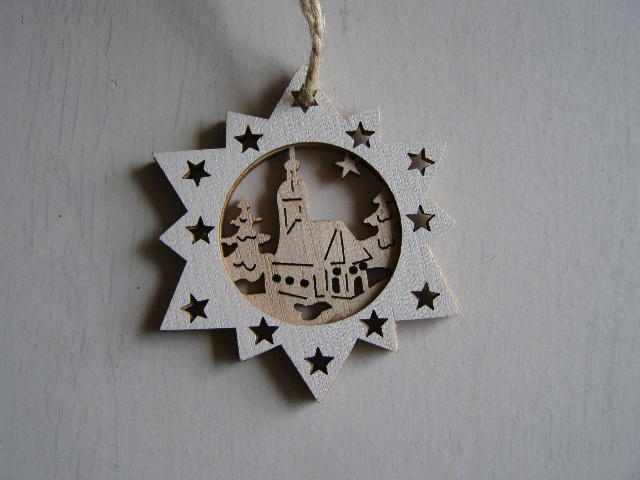 dřevo závěs - hvězdička s kostelíčkemskladem 12 ks24 Kč/ ks