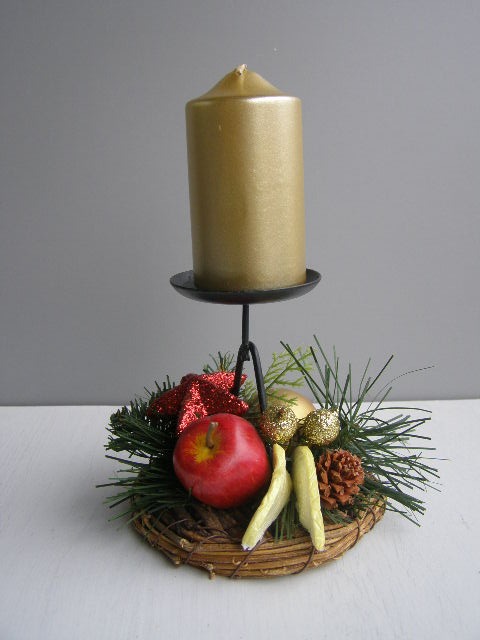 Nahoře kovový bodec na svíčku do průměru 5 cm. Dekorace včetně zlaté svíčky.
