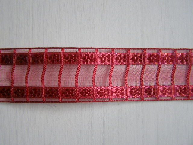 Monofilová stuha s mřížkou a tkanými kytičkami na kraji šíře 40 mm.