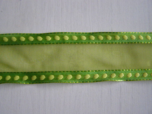 Monofilová stuha s vetkanými puntíky na okraji. Okraj zpevněn drátem.