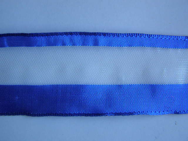 Monofilová stuha s látkovými pruhy na kraji. Okraj vyztužen drátem. Šíře 4 cm.