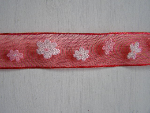 Monofilová stuha s plastickým potiskem kytky. Okraj zpevněn drátem.