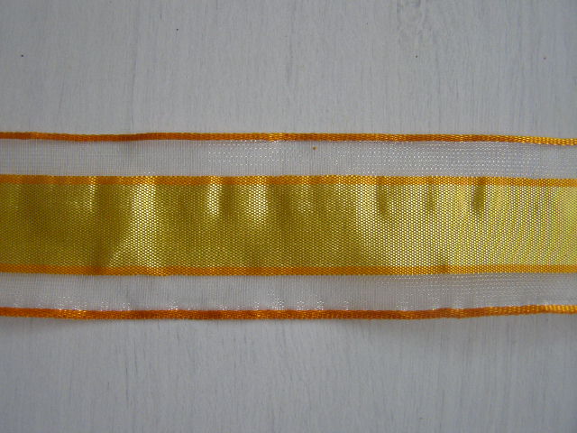 Monofilová stuha s plátnovým pruhem uprostřed. Okraj vyztužen drátem.
