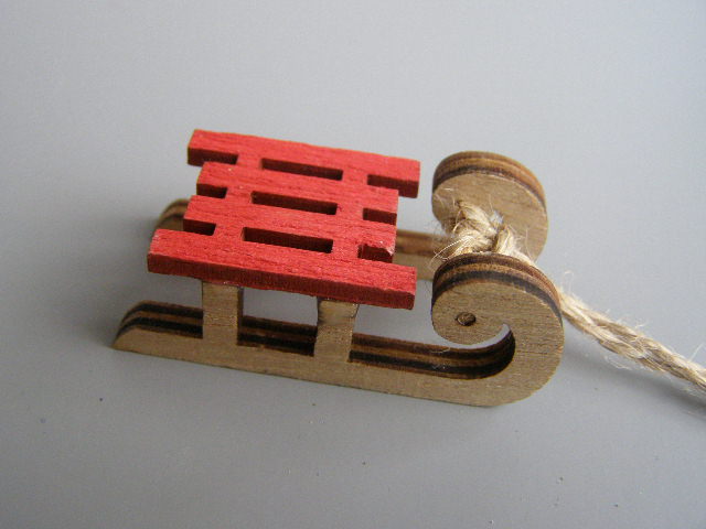 Dřevěné sáňky o velikosti 5 x 2,3 cm.