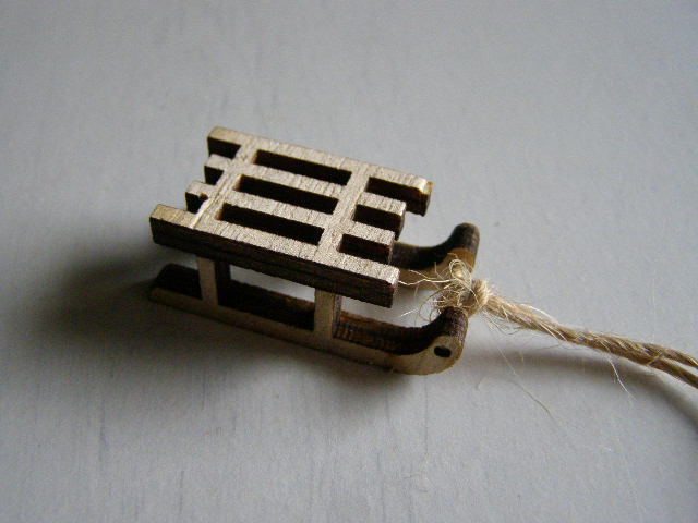 Dřevěné sáňky o velikosti 4 x 2 cm.