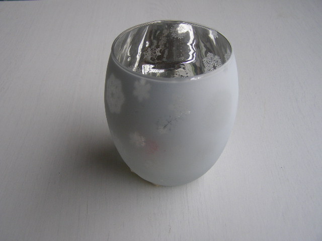 Skleněný svícen na čajovku nebo svíčku, bílostříbrný s dekorem vloček.