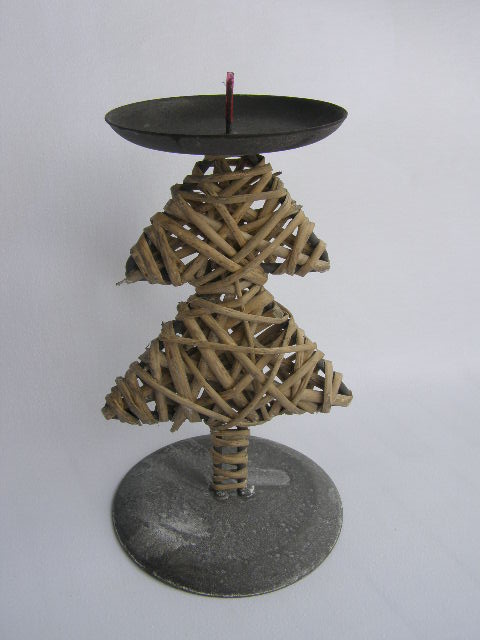 Svícen na širokou svíčku. Základem je kovový černý svícen, s lehkou patinou. Noha vypletena proutím do tvaru stromku.