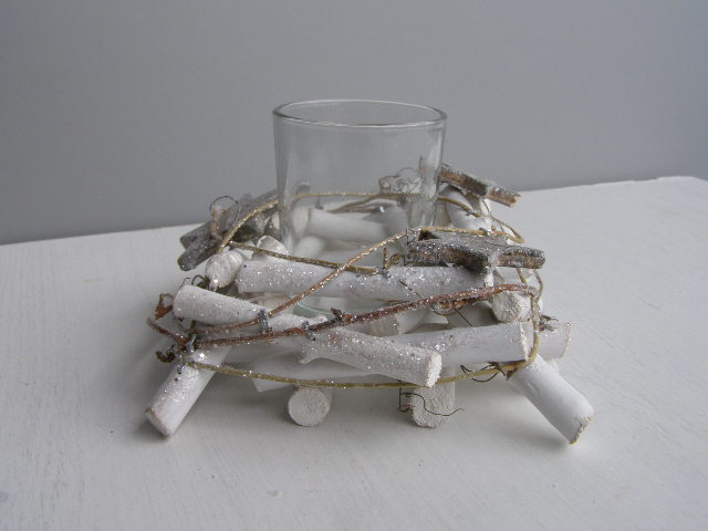 Dřevěný klacíkový svícen ozdobený přírodním materiálem - klacíky, proutí, dozdobený stříbrnými hvězdami a kouličkami. Uprostřed sklenička na svíčku.