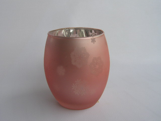 Skleněný svícen na čajovku nebo svíčku, růžovostříbrný s dekorem vloček.