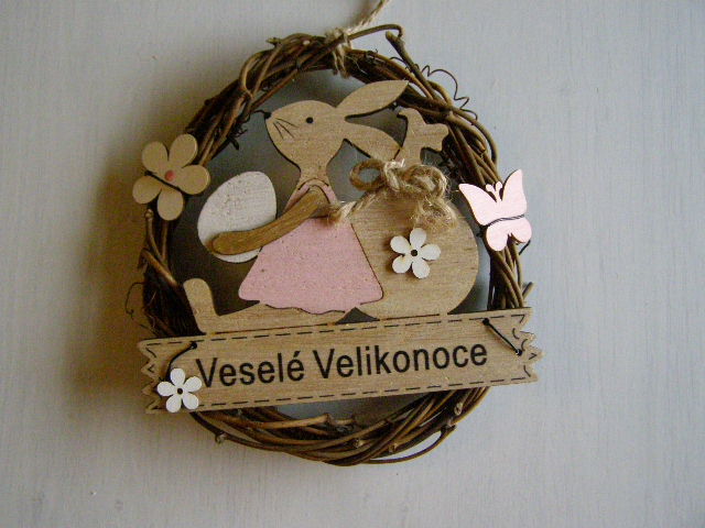 Přírodní věneček s dřevěným zajíčkem a nápisem Veselé Velikonoce.