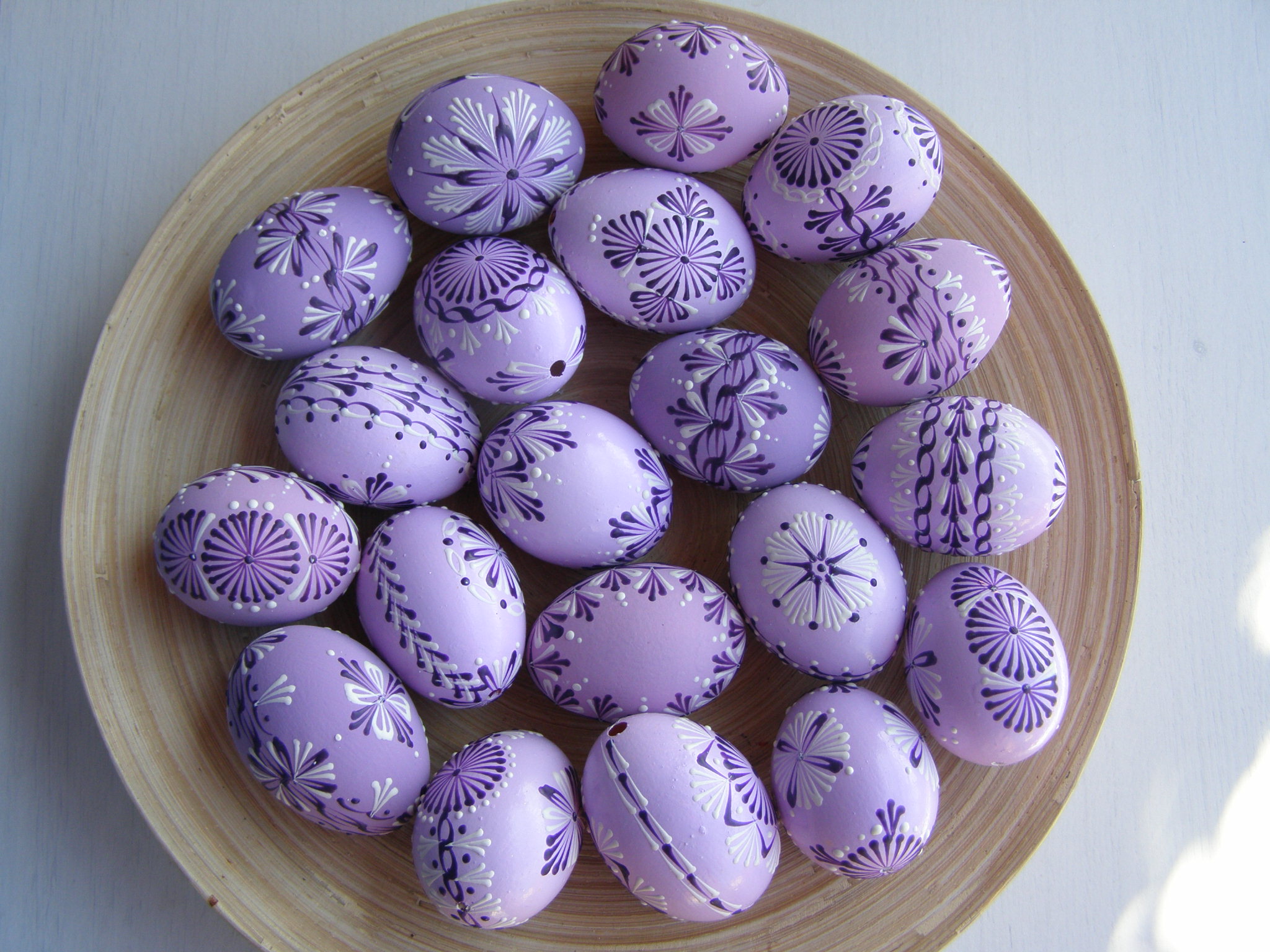 Barevná kraslice doplněná bílým a fialovým voskovým vzorem. Každá kraslice je navlečena na saténové stužce.