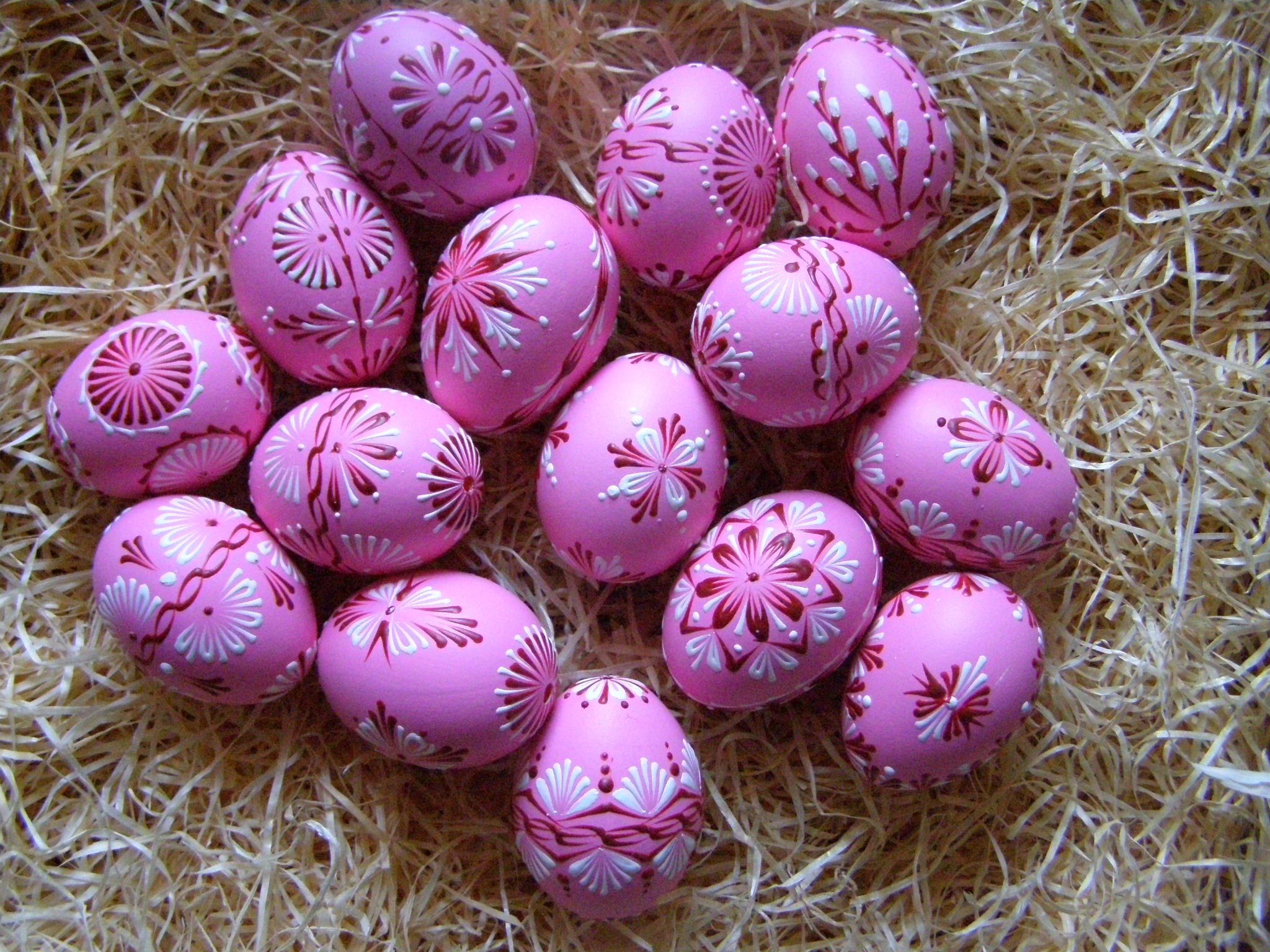 Slepičí kraslice zdobená klasickou technikou voskového reliéfu.