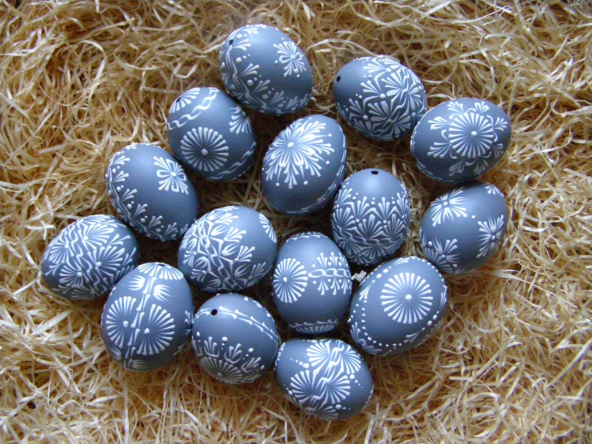 Slepičí kraslice zdobená klasickou technikou voskového reliéfu.