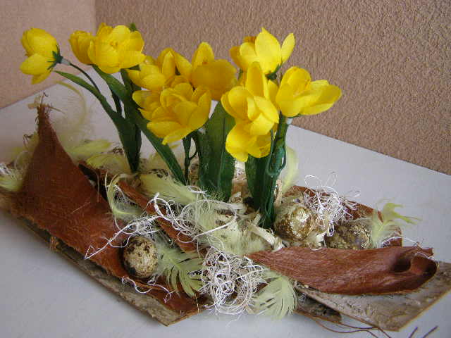 Podkladem jsou různě položené březové pláty, dozdobené umělými krokusy, pravými křepelčími vajíčky a peříčky.
