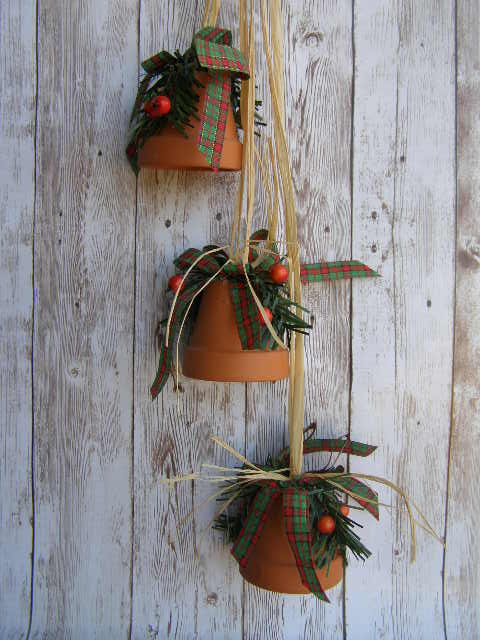 Závěs z květináčových zvonečků. Jsou ozdobeny umělým chvojím, jeřabinou a mašličkou. Zavěšeny na přírodním lýku. V květináčku je dřevěné srdíčko, takže zvonečky slabě cinkají.